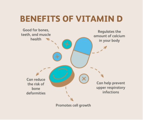 يساعد فيتامين د الجسم على تنظيم مستويات الكالسيوم والفوسفات، الضرورية لتقوية العظام والأسنان. بدون كمية كافية من فيتامين د، يصعب على الجسم امتصاص الكالسيوم، مما يزيد من خطر الإصابة بأمراض مثل الكساح عند الأطفال وهشاشة العظام عند البالغين.