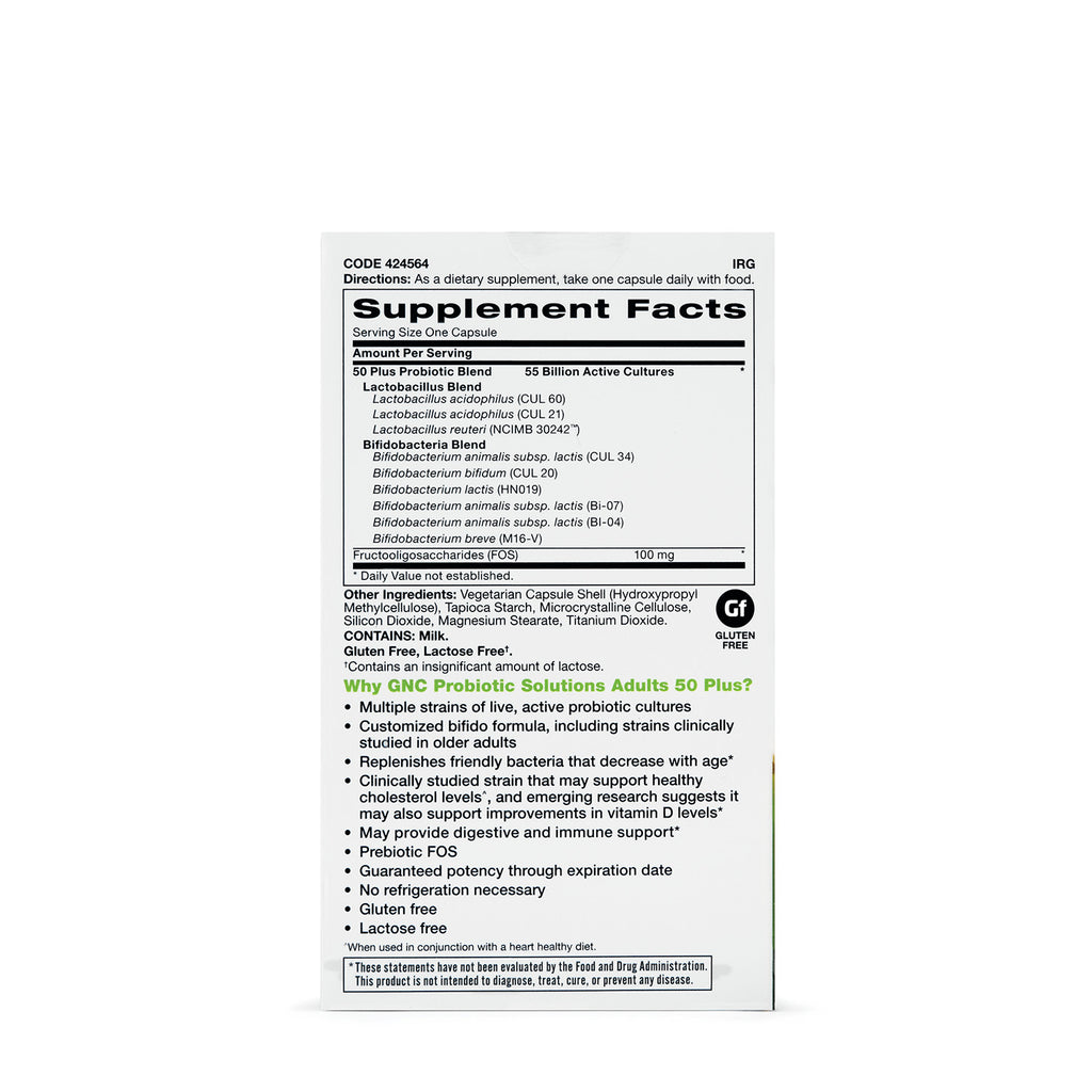 GNC Probiotic Solutions Adults 50 Plus supports digestive and immune health for individuals over 50 with 55 billion CFU of probiotics.
