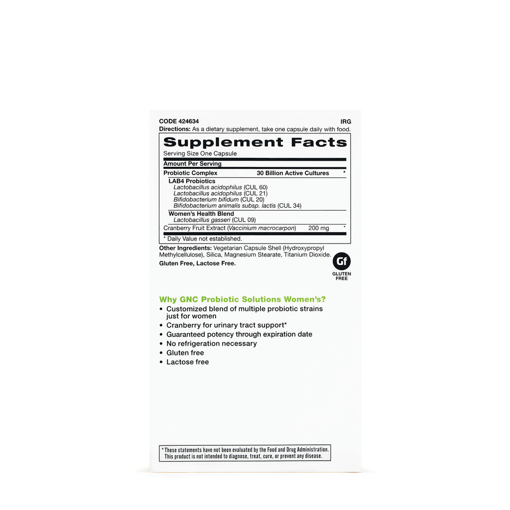 GNC Probiotic Solutions Women's is a dietary supplement designed to support digestive and immune health in women. This product contains 30 billion CFUs of beneficial bacteria per capsule, featuring five different probiotic strains to enhance gut bacterial balance.