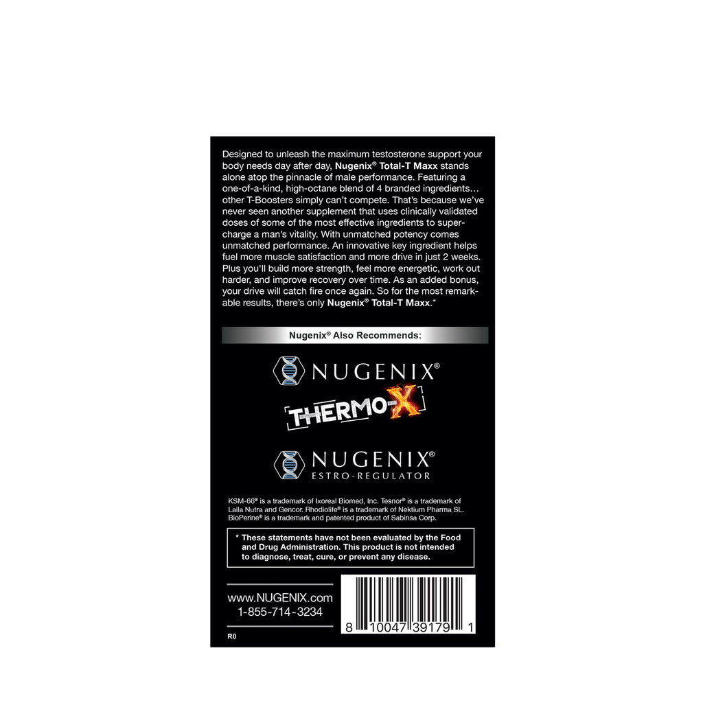 Nugenix® Total-T Maxx is a dietary supplement designed to increase free and total testosterone levels in men, enhancing physical and sexual performance. It contains a unique blend of scientifically studied ingredients to support vitality and endurance.