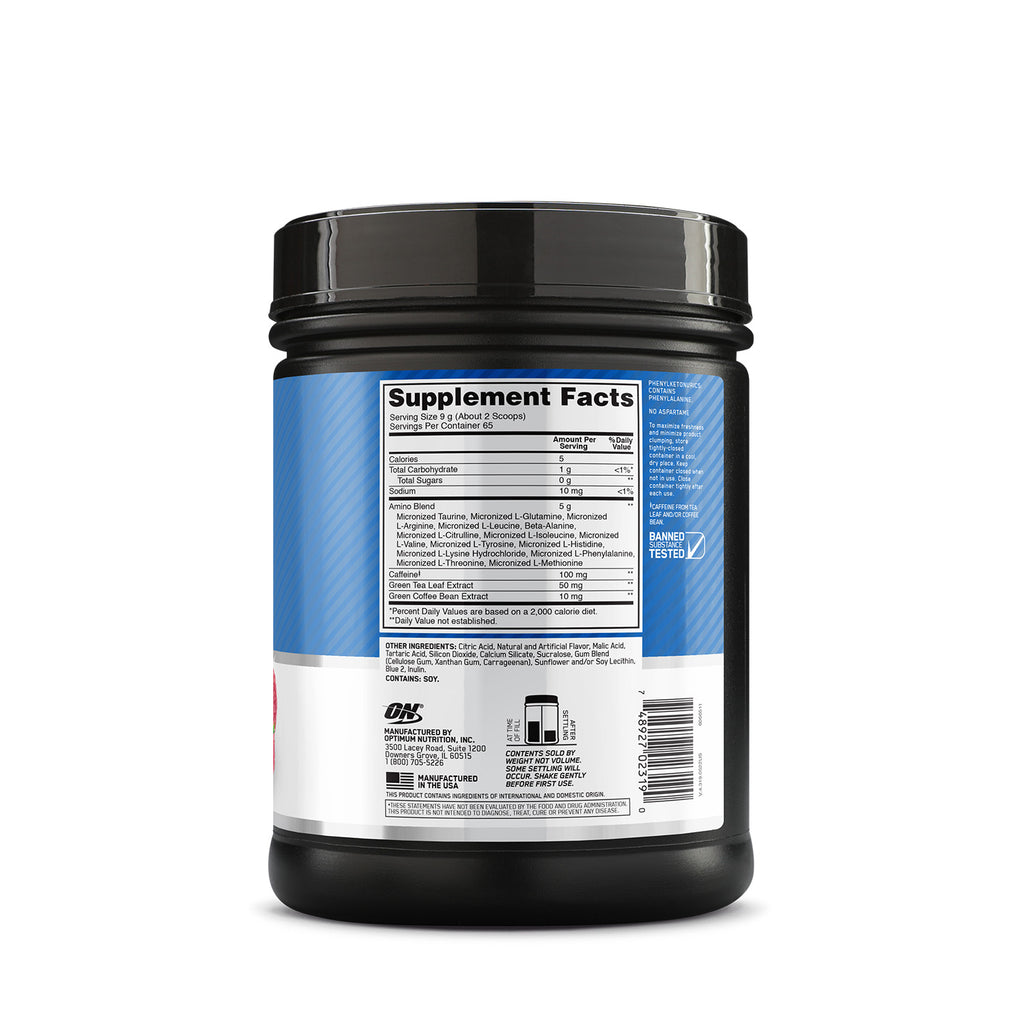 منتج Optimum Nutrition, Essential Amino Energy يقدم مزيجًا من الأحماض الأمينية ومصادر الكافيين الطبيعية. يدعم تعافي العضلات ويوفر دفعة من الطاقة. يحتوي كل حصة على العناصر الغذائية الأساسية وهو خالٍ من السعرات الحرارية والسكر.