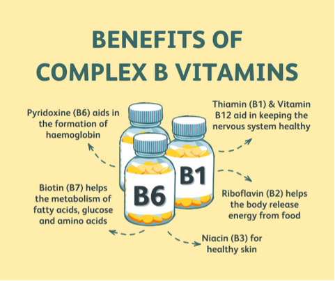 فيتامينات ب هي مجموعة من العناصر الغذائية الأساسية التي تدعم التمثيل الغذائي والصحة العامة للجسم. تشمل هذه المجموعة: الثيامين (B1)، الريبوفلافين (B2)، النياسين (B3)، حمض البانتوثنيك (B5)، البيريدوكسين (B6)، البيوتين (B7)، الفولات (B9)، والسيانوكوبالامين (B12)، وتُعرف مجتمعة باسم مجموعة فيتامين ب.